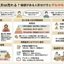 戦前の市松人形や、人間国宝クラスの作品、状態の良いビスクドールなどは、美術品市場での取引価格に基づき高額査定となります。