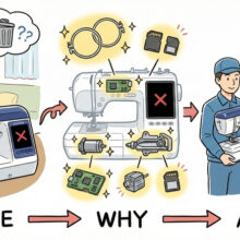 長期間使っていなかったミシンのはずみ車が固い場合、絶対に力を込めて無理やり回さないでください。内部のプラスチック製のギアが割れたり、タイミングベルトが切れたりして、修理不能になる恐れがあります。**「動かないなら、動かないまま」**査定に出すのが賢明です。