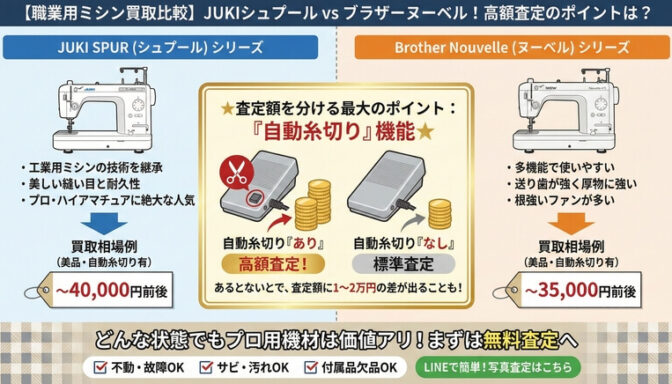 - 工業用ミシン、職業用ミシン: JUKI、ブラザー、ペガサスなど。重くて大きいほど価値が高い傾向にあります。