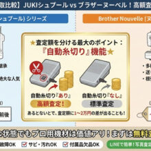 もちろん、「自動糸切り機能なし」のベーシックなモデル(例:JUKI TL-30、Brother Nouvelle 270など)であっても、職業用ミシンとしての基本性能は非常に高いため、十分に高価買取の対象となります。しかし、「機能あり」のモデルは、さらにワンランク上の査定が期待できると覚えておきましょう。